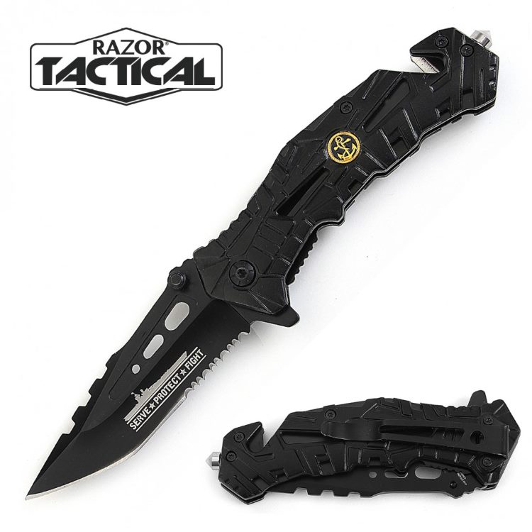 Features "Serve Protect Fight" graphic on blade and Navy badge on handle